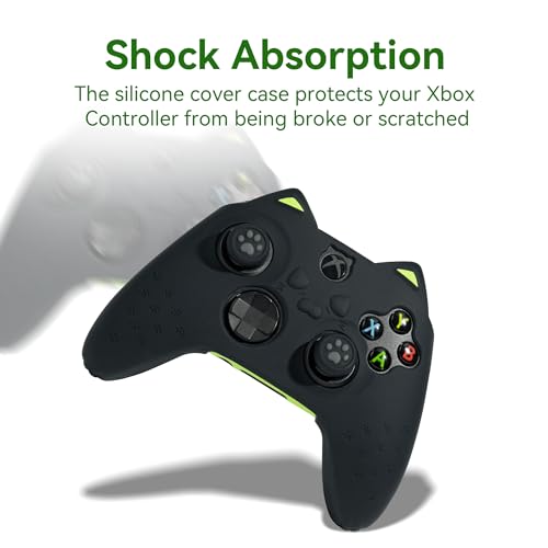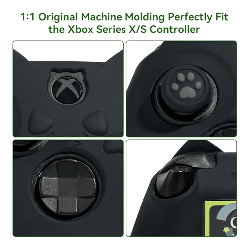 Features of Geekshare Black Cat Paw Xbox Series X Controller Skin Grips Set: — Package Includes: 1* silicone controller skin + 1* customized sticker + 1 pair of thumb grips.– The surface of the silicone handle is designed with little cat paw shaped grooves to optimize the airflow, keep your hands cool and prevent slipping.– The cute cat ears and paw designd controller skin and matching stickers and grips protect your handle while still keep your controller stylish and eye-catching.Item Specifications: Material: High Quality SiliconeColor: BlackNotices: Compatible with Xbox series X controller OnlyPlease feel free to contact us if you have any questions. We promise that we will try our best to make you satisfied. Wish you have a pleasant shopping experience here. Thank you for your support!