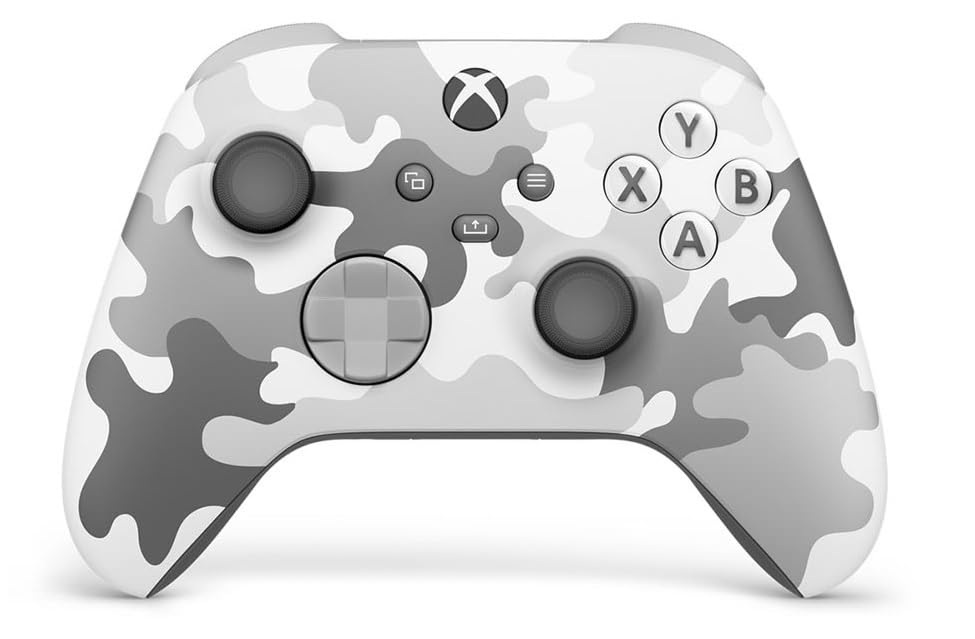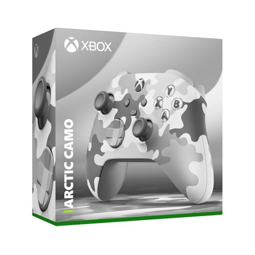 Experience the Xbox Wireless Controller – Arctic Camo Special Edition, featuring a rugged white and gray camouflage pattern. Enjoy modern sculpted surfaces and refined geometry for enhanced comfort during gameplay.
